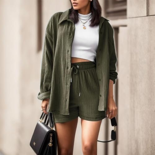 2024 Women’s Casual 2 Piece Outfits Bohemian Wrinkled Lightweight Long Sleeve Button Down Shirt and Shorts Set Ag ‎womens Clothing Sets AG