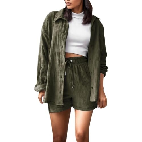 Shop conveniently 2024 Women’s Casual 2 Piece Outfits Bohemian Wrinkled Lightweight Long Sleeve Button Down Shirt and Shorts Set online in 2024