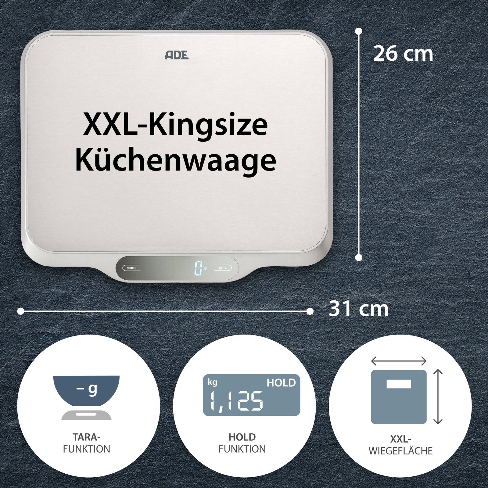 ADE Küchenwaage Waage mit großer XXL-Wiegefläche aus Edelstahl, für präzises Wiegen bis 15kg, mit Zuwiegefunktion (Tara) und Auto-Hold ADE Küchenwaagen