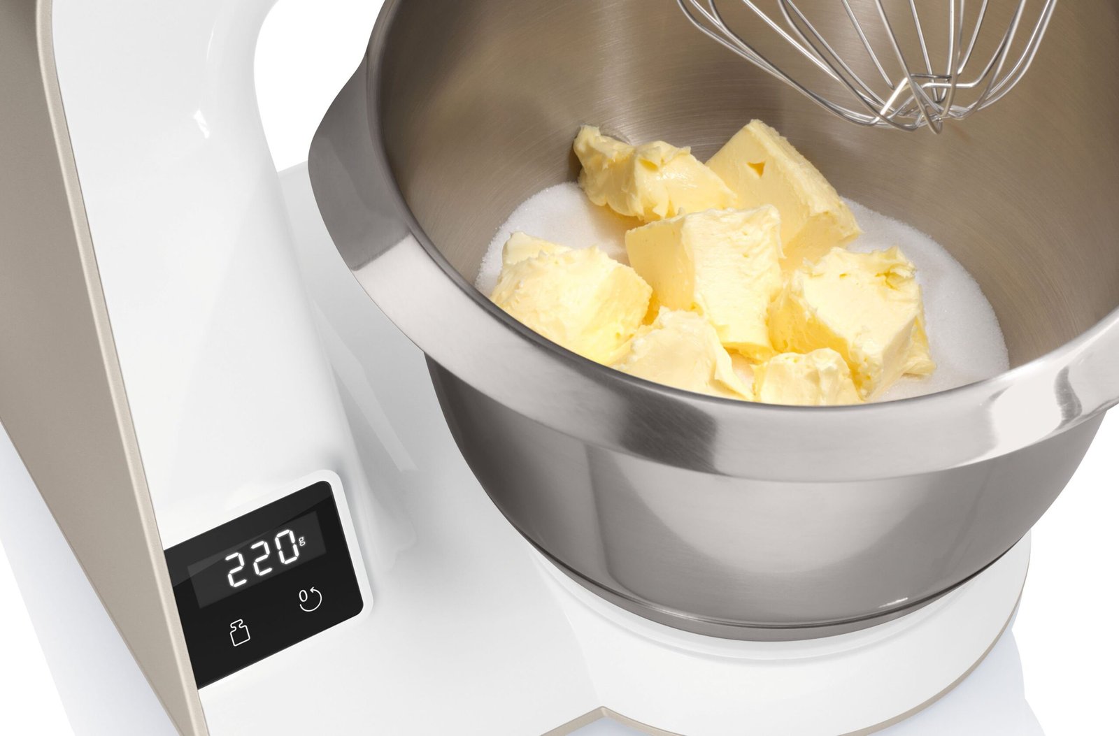 Die Bosch Küchenmaschine mit integrierter Waage “MUM5XW20” ist eine flexible Küchenmaschine für die Zubereitung verschiedenster Gerichte. Dank der integrierten Waage können alle Rezept-Zutaten direkt in der Schüssel und im Mixer in 5 Gramm-Schritten abgewogen werden. Kraftvoller 1.000 Watt Motor.