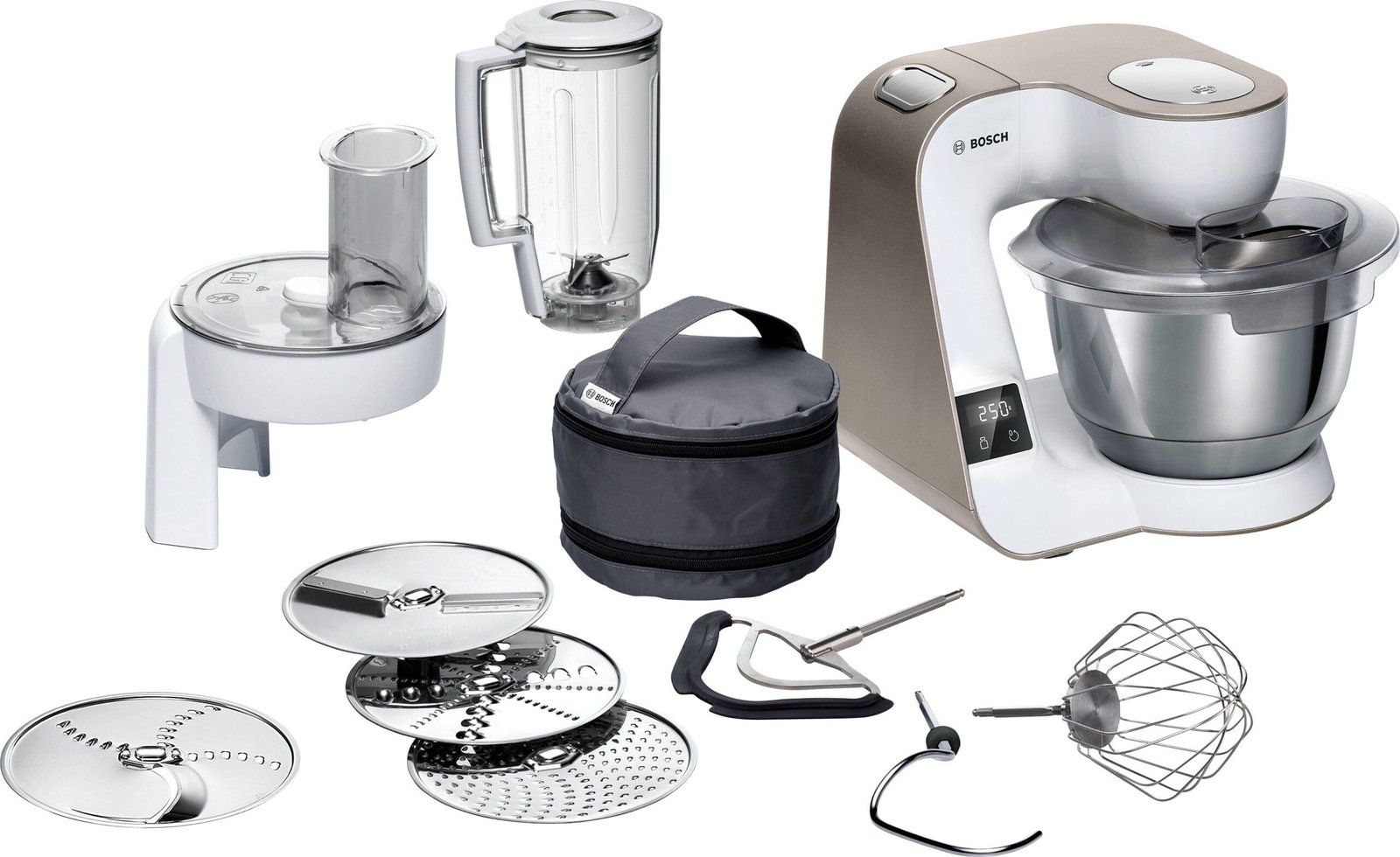 BOSCH BOSCH Küchenmaschine Serie 4 MUM5XW20, integr. Waage, Durchlaufschnitzler, weiß/champagner Serie 4 MUM5XW20, integr. Waage, Durchlaufschnitzler, weiß/champagner, 1000 W, 3,9 l Schüssel, 4 Scheiben, Mixer, Edelstahlschüssel, Knethaken/Rühr-/Silikonbesen Kompakt-Küchenmaschinen