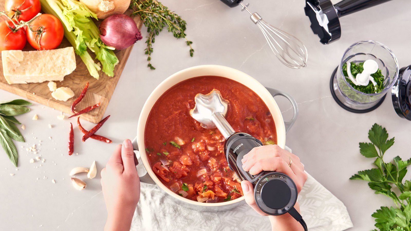 Genießen Sie maximale Präzision und Leistung mit dem MultiQuick 5 Vario von Braun. Der kompakte Stabmixer verwandelt im Handumdrehen Obst und Gemüse in frische Smoothies, Kartoffeln zu Püree und andere Zutaten in köstliche Saucen und Dips. Ihrer Fantasie sind keine Grenzen gesetzt. Der leistungsstarke 1000-Watt-Motor arbeitet mit voller Power in 21 Geschwindigkeitsstufen und einer Turbofunktion. Dank des praktischen EasyClick-Systems sind die passenden Zubehörteile, wie Schneebesen und ein praktischer Zerkleinerer im Handumdrehen ausgewechselt. Der Kunststoffbecher fasst 600 ml und eignet sich für die Zubereitung von Saucen und kalten Getränken. Der erweiterte Schneidebereich durch PowerBell Plus ermöglicht die Verarbeitung ganzer Lebensmittel, während die SplashControl-Technologie jederzeit für eine saubere Küche sorgt. Der vielseitige Küchenhelfer ist bis auf den Motorteil spülmaschinengeeignet, sodass einer mühelosen Reinigung der Maschine nach getaner Arbeit nichts im Wege steht.