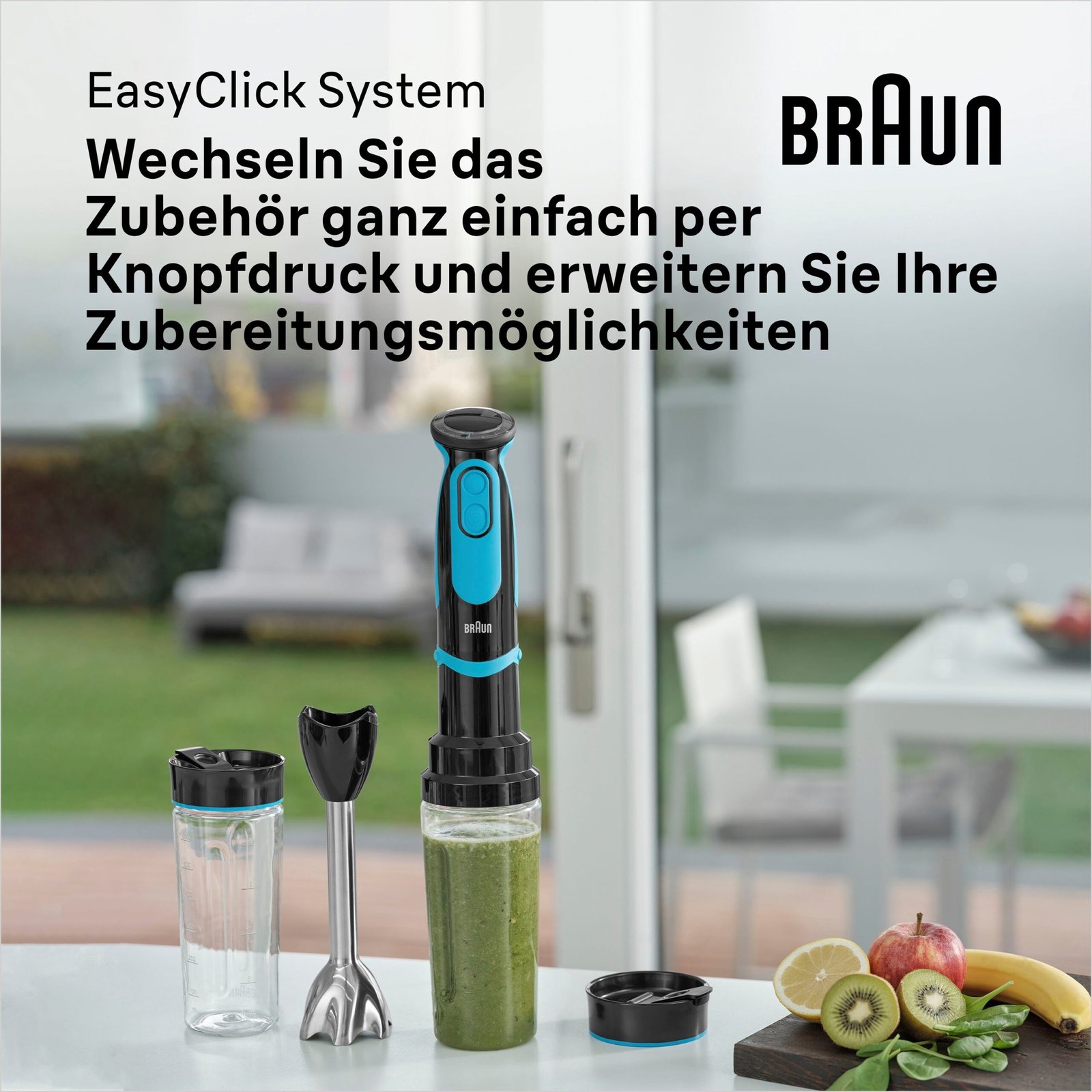 Genießen Sie maximale Präzision und Leistung mit dem MultiQuick 5 Vario von Braun. Der kompakte Stabmixer verwandelt im Handumdrehen Obst und Gemüse in frische Smoothies, Kartoffeln zu Püree und andere Zutaten in köstliche Saucen und Dips. Ihrer Fantasie sind keine Grenzen gesetzt. Der leistungsstarke 1000-Watt-Motor arbeitet mit voller Power in 21 Geschwindigkeitsstufen und einer Turbofunktion. Dank des praktischen EasyClick-Systems sind die passenden Zubehörteile, wie Schneebesen und ein praktischer Zerkleinerer im Handumdrehen ausgewechselt. Der erweiterte Schneidebereich durch PowerBell Plus ermöglicht die Verarbeitung ganzer Lebensmittel, während die SplashControl-Technologie jederzeit für eine saubere Küche sorgt. Der vielseitige Küchenhelfer ist bis auf den Motorteil spülmaschinengeeignet, sodass einer mühelosen Reinigung der Maschine nach getaner Arbeit nichts im Wege steht. BLEND & GO AUFSATZ: Bereiten Sie Ihren gesunden Smoothie direkt in der 600ml Sportflasche zu und genießen ihn unterwegs