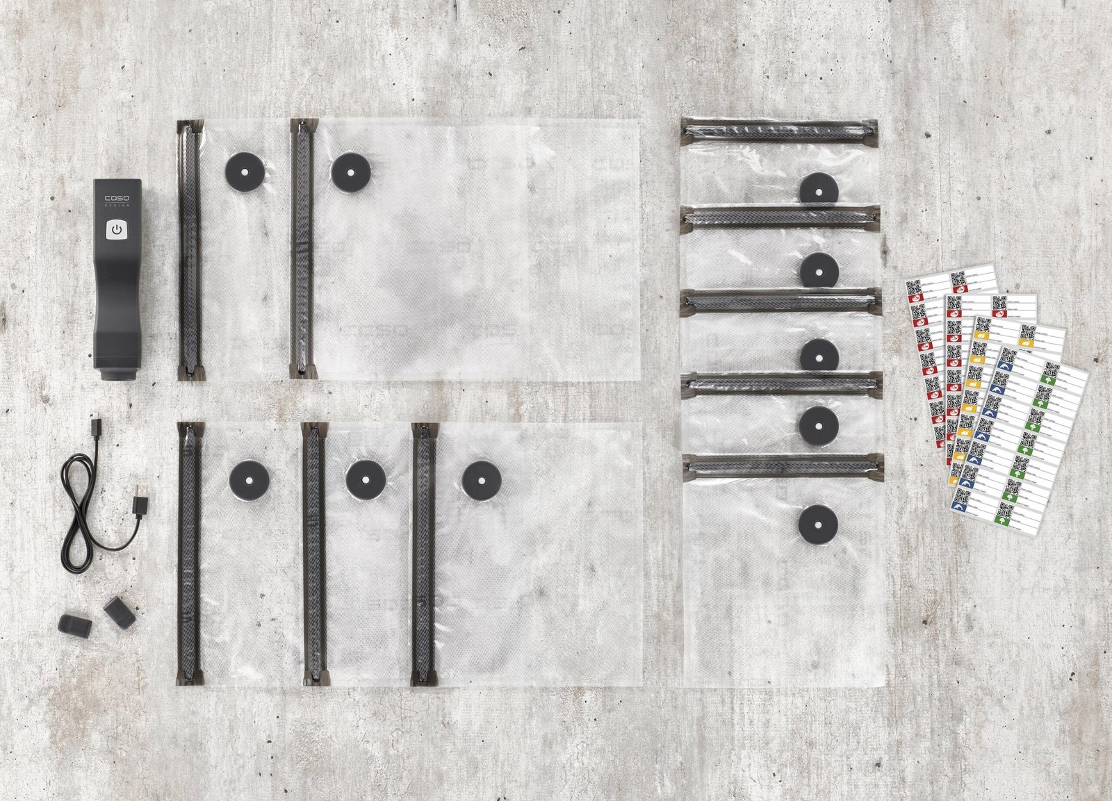 Kabelloser Handvakuumierer inkl praktischen ZIP Vakuumbeuteln. Pumpenleistung 3 l/min. Langlebiger Lithium-Ionen-Akku, auch während des Ladens vakuumieren. Praktische LED-Anzeige, weiß bei vollem und rot bei leerem Akkustand.