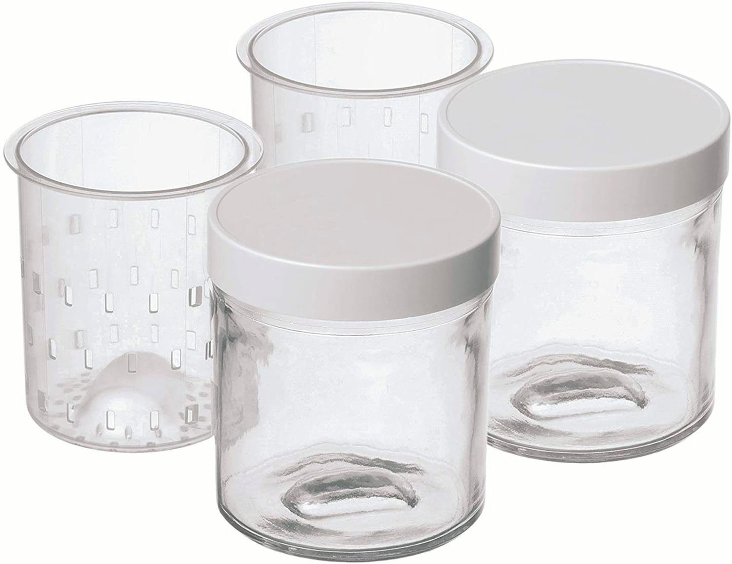 2 Glasbehälter inkl. Sieb-Einsatz und Deckel mit 250ml Fassungsvermögen für die Herstellung von Frischkäse für den Joghurt- & Frischkäsezubereiter YM400E von Cuisinart.