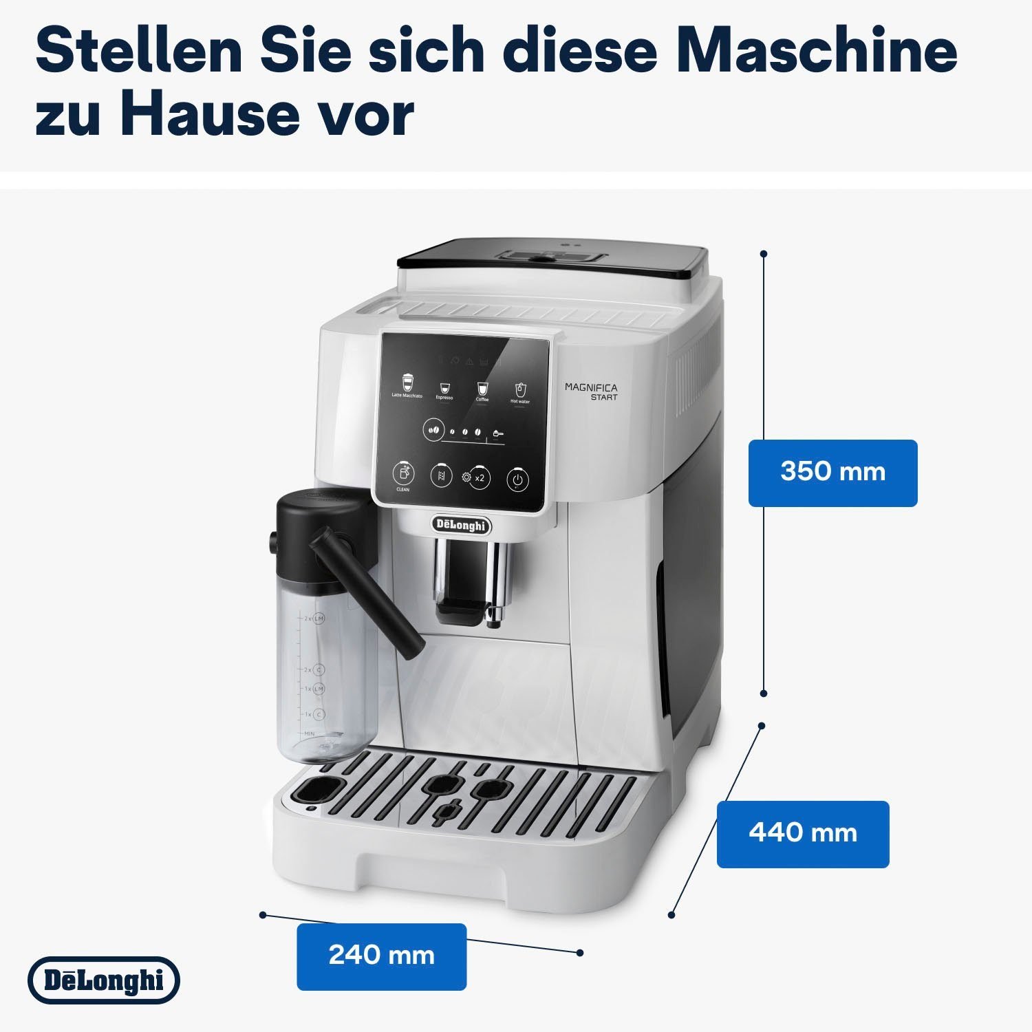 Magnifica Start vereint die Erfahrung, das Wissen und die Technologie von De’Longhi. So erhalten Sie immer das beste Ergebnis – von der Bohne in die Tasse. Speziell für Verbraucherinnen und Verbraucher konzipiert, die die Welt der Kaffeeautomaten gerade erst entdecken und auf der Suche nach einer One-Touch-Lösung sind. Die neue Kaffeemaschine „von der Bohne in die Tasse“ von De’Longhi bietet etwas für jeden Kaffeegeschmack mit einem benutzerfreundlichen Bedienfeld und einer maßgeschneiderten Auswahl an Getränken „auf einen Tastendruck“. Genießen Sie die einfache Interaktion dank der schwarzen und weißen Symbole auf dem Bedienfeld für direkten Trinkgenuss mit nur einem Tastendruck.