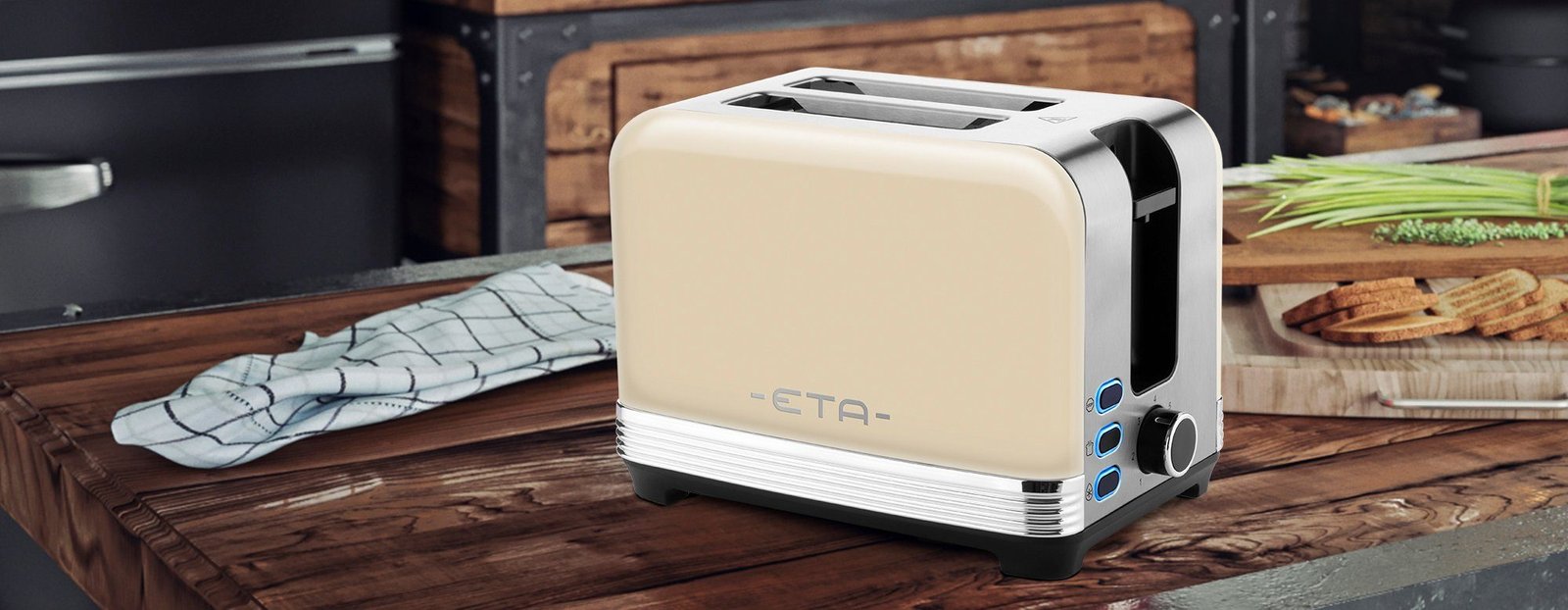 Ein praktischer Helfer in die Küche im originalen beige Retrostil. Bereiten Sie schnelle und warme Speisen mit 980 W Leistungsaufnahme zu. Mit dem Toaster ETA Storio können Sie 2 Stücke des Toasts gleichzeitig und Sie können aus 7 Bräunungsstufen wählen.