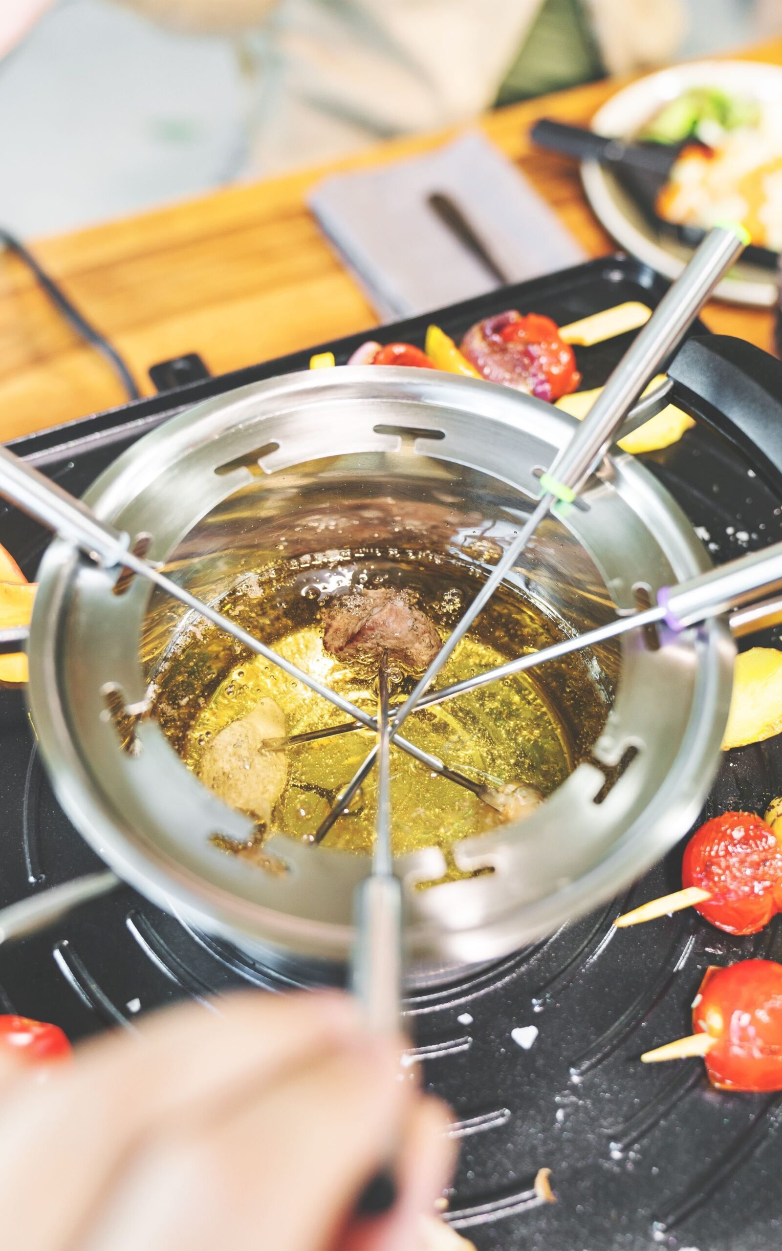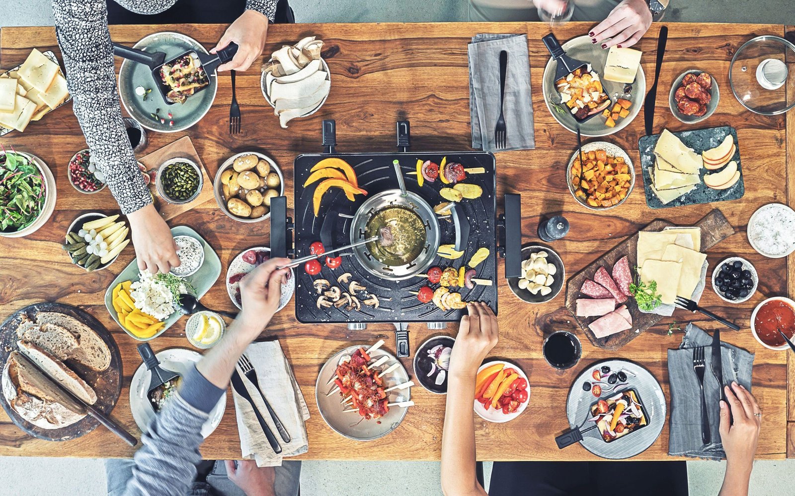 Raclette & Fondue für 1-9 Personen • Mit praktischem Parkdeck zum Warmhalten oder zum Abstellen von unbenutzten Pfännchen • Einzeln oder kombiniert verwendbar • Zum Grillen und Überbacken, für Käse-, Fleisch-, Gemüse und Schokofondue • Raclette von 150°C—280°C, Fondue von 40°C—180°C • Beleuchtetes LCD-Display • Große gerippte Grillplatte mit Keramik-Antihaftbeschichtung, abnehmbar • 9 antihaftbeschichtete Raclette-Pfännchen • Fondue-Topf aus Edelstahl, 1,0 Liter mit Deckel, spülmaschinengeeignet • Inklusive 9 Pfännchen, 9 Spachtel und 9 Fonduegabeln • Edelstahl-Gehäuse • 2200 W (Raclette) + 300 W (Fondue)