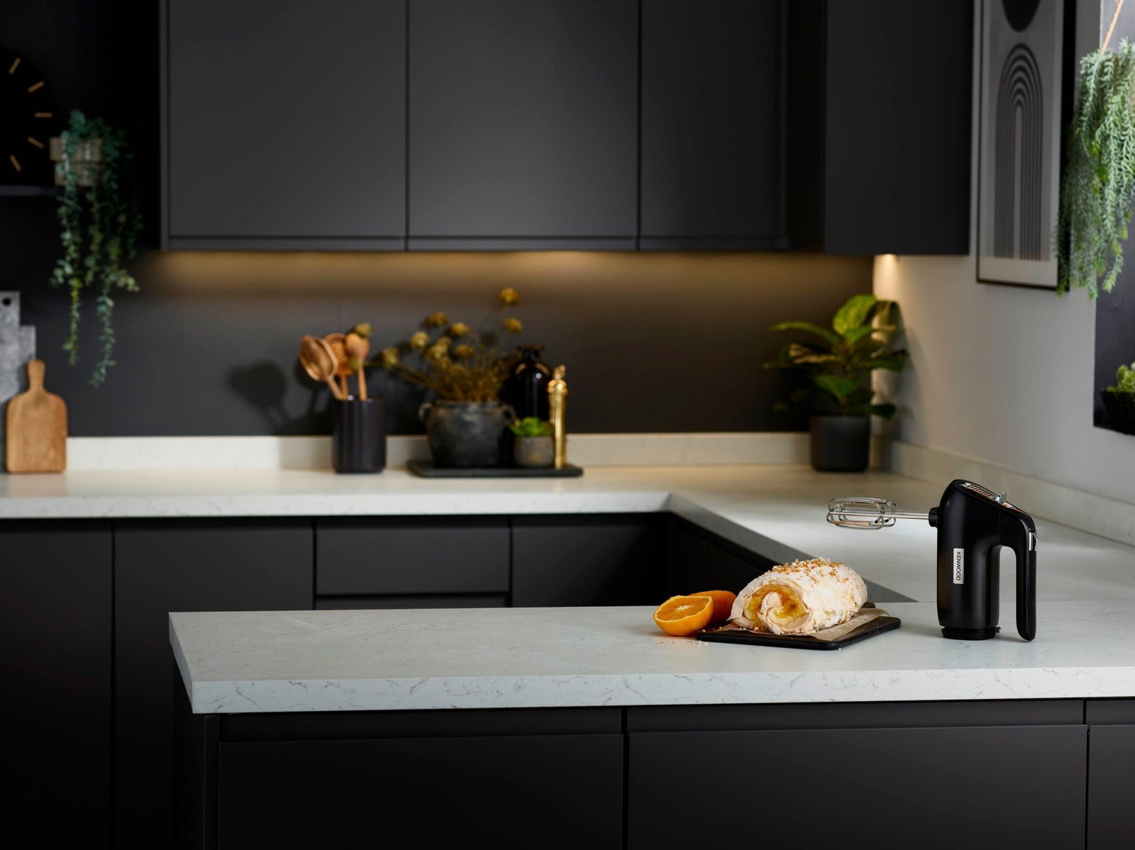 QuickMix+ im schwarzen Design ist Teil der neuen Autograph Collection bestehend aus: Titanium Chef Baker XL , Titanium Chef Baker, MultiPro Express Weigh+ XL und QuickMix+. Ein leistungsstarker und hochwertiger Handmixer, perfekt für das Backen zu Hause. Der leistungsstarke und dennoch leise 650 Watt Motor macht jedes Rezept zum Vergnügen, während die langsame Startgeschwindigkeit, die variable Geschwindigkeitsregelung und die integrierte Pulsfunktion dafür sorgen, dass du stets die Kontrolle behältst. Der komfortable SureGrip TM Griff bietet perfekten Halt beim Rühren. Die einzigartige SureEject TM Entriegelung für die Rührelemente an der Vorderseite des Handmixers sorgt dafür, dass die Rührbesen während des Gebrauchs nicht versehentlich ausgeworfen werden können. Dank der Kabelaufwicklung lässt sich der QuickMix + schnell und einfach aufbewahren und verwenden.