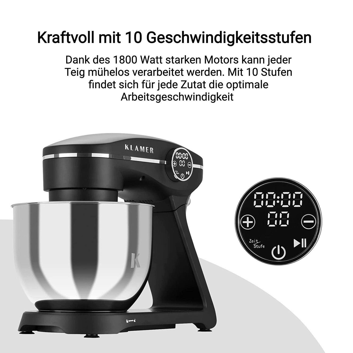 KLAMER Küchenmaschine 1800W, Knetmaschine mit 6 Liter Edelstahl Schüssel, 10 Geschwindigkei…, 1800 W, 6 l Schüssel, Spritzschutz, 3 Werkzeuge, Saugfüße, digitales Display, Timer Multifunktionsküchenmaschinen KLAMER