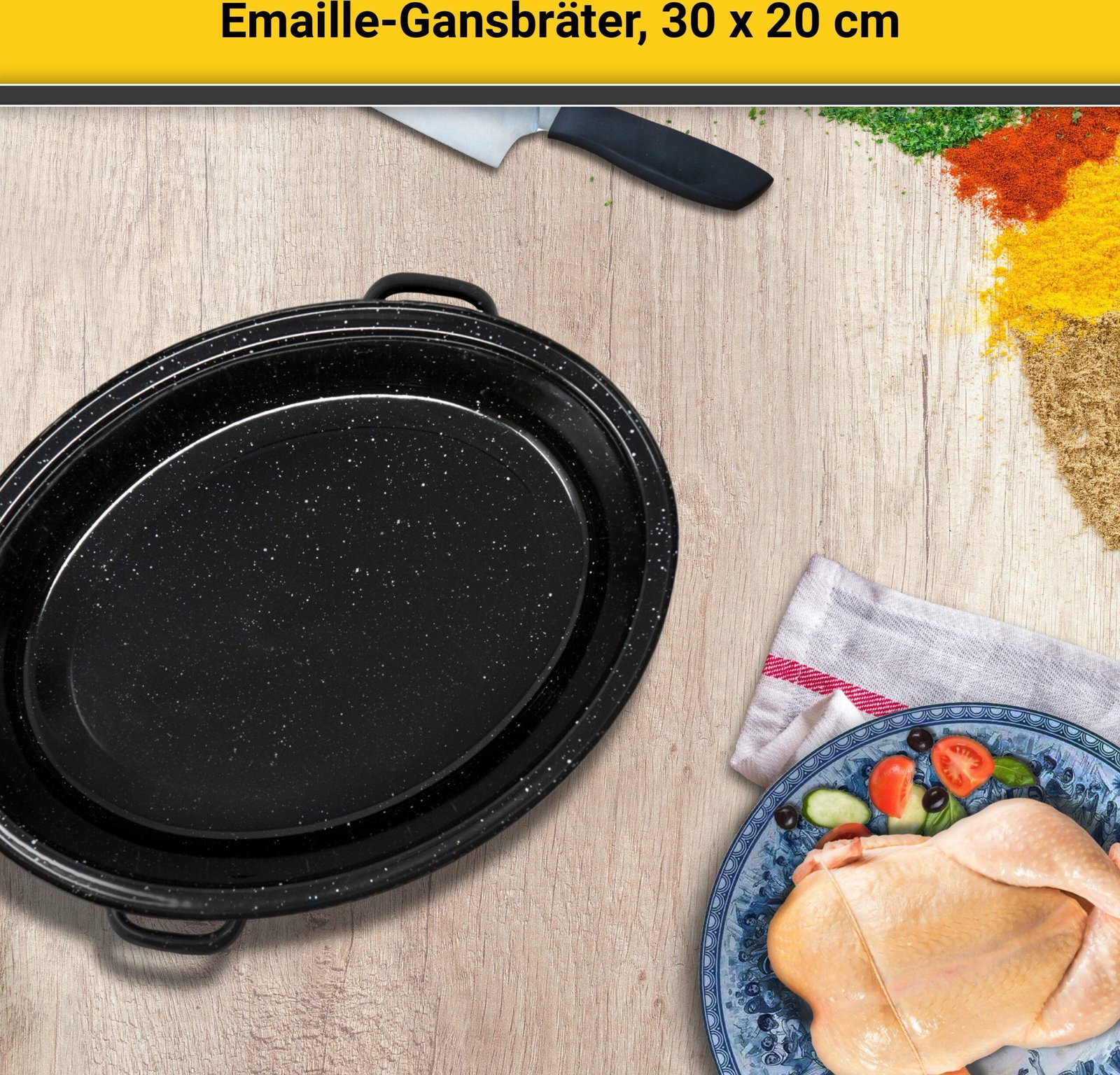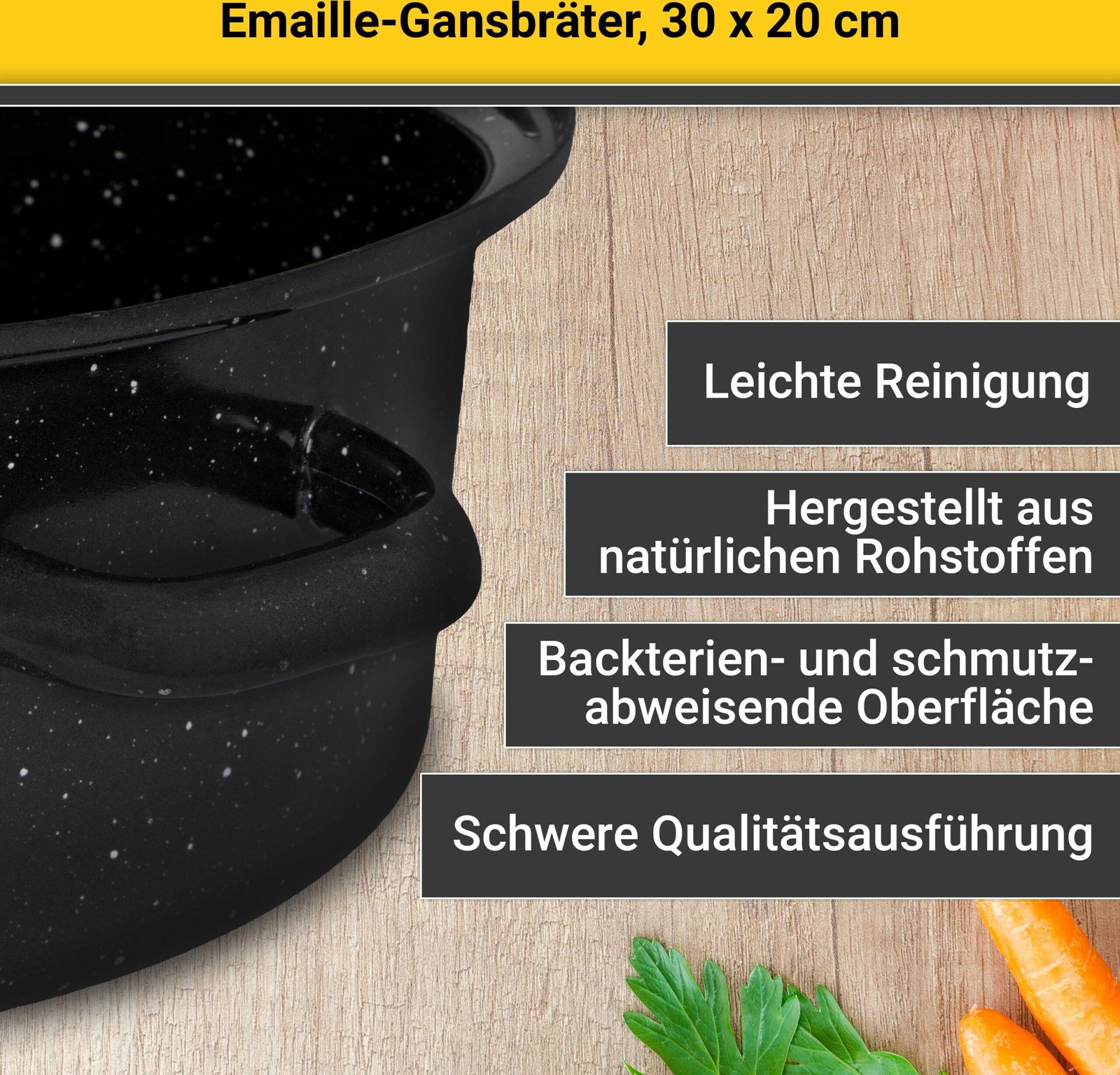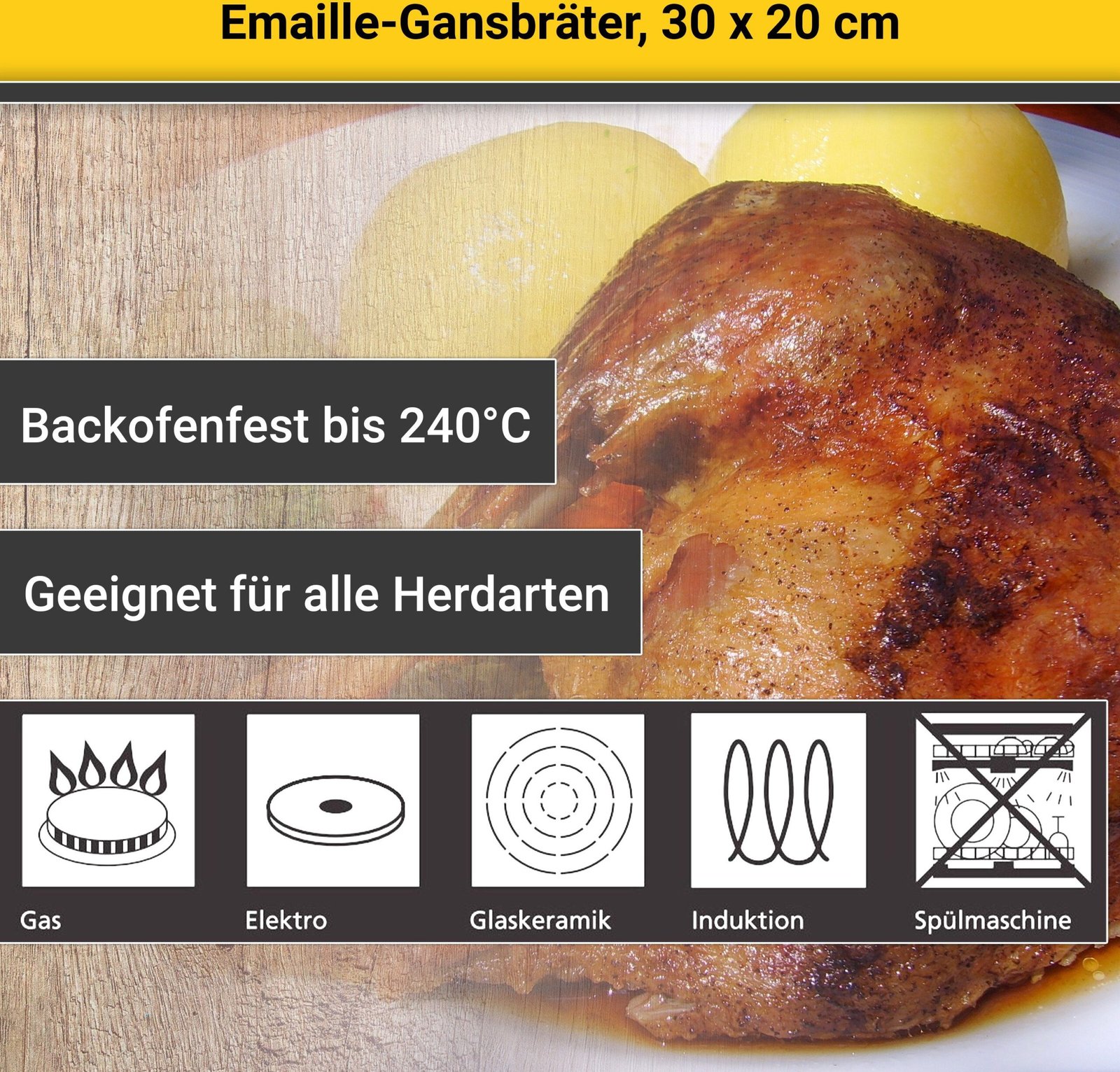 Der emaillierte Gansbräter mit Topfdeckel ist vielseitig einsetzbar. Er eignet sich hervorragend für Braten und Geflügel sowie zum Überbacken von Speisen. Der Kreislauf der aufsteigenden und abtropfenden Dämpfe sorgt dafür, dass das Bratgut schön saftig bleibt. Der funktionelle Deckel ist auch ideal als Gratinform einsetzbar. Besonderheiten: Das Besondere an Emaille-Geschirr ist, dass es aus natürlichen Rohstoffen hergestellt wird. Alle Lebensmittel behalten in diesem Kochgeschirr ihren natürlichen und reinen Geschmack. Außerdem ist Emaille für Allergiker geeignet. Die porenfreie, glatte Oberfläche ist bakterien- und schmutzabweisend und ermöglicht so eine optimale Hygiene im Haushalt. Mit dem widerstandsfähigen und pflegeleichten Kochgeschirr aus Emaille werden Sie bei sachgemäßem Gebrauch und richtiger Pflege lange Freude haben.