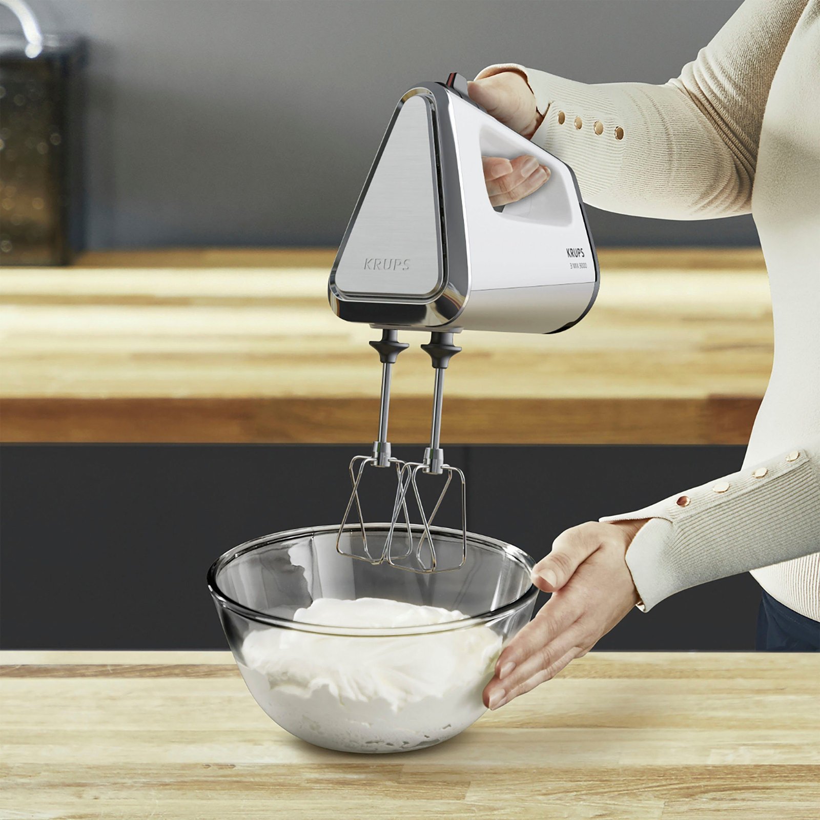 Entdecken Sie einen Handmixer, auf den Sie sich verlassen können. Der Krups 3 Mix 9000 kombiniert ein solides Design mit kraftvoller 750 Watt-Leistung und einem leistungsstarken Rührwerk, für optimale Zubereitungsergebnisse jeden Tag. Von luftig aufgeschlagener Sahne, Eischnee, Cremes, Puddings und Soßen bis hin zu zähen, schweren und perfekt gekneteten Brot-, Pizza- und Kuchenteigen.