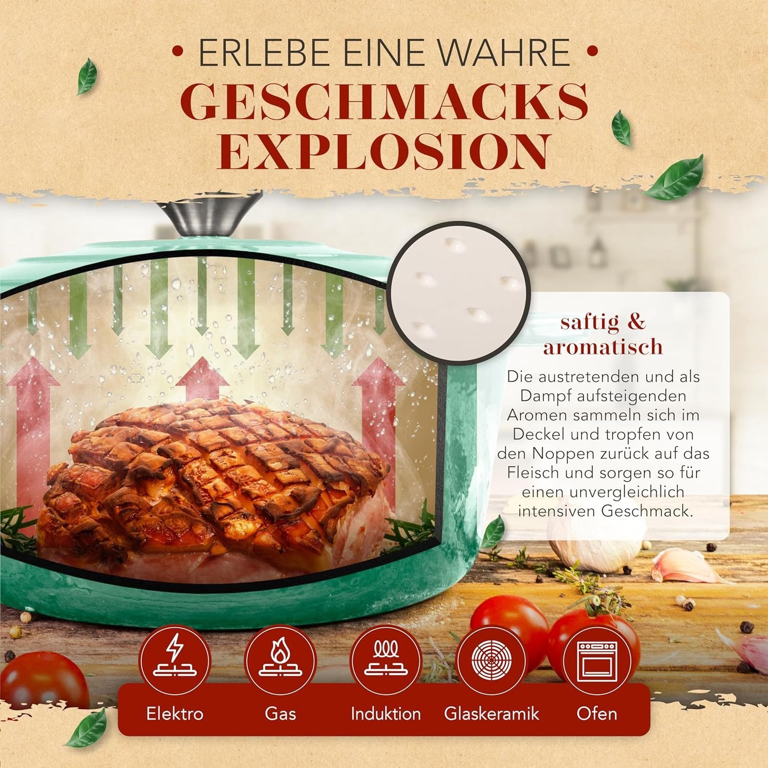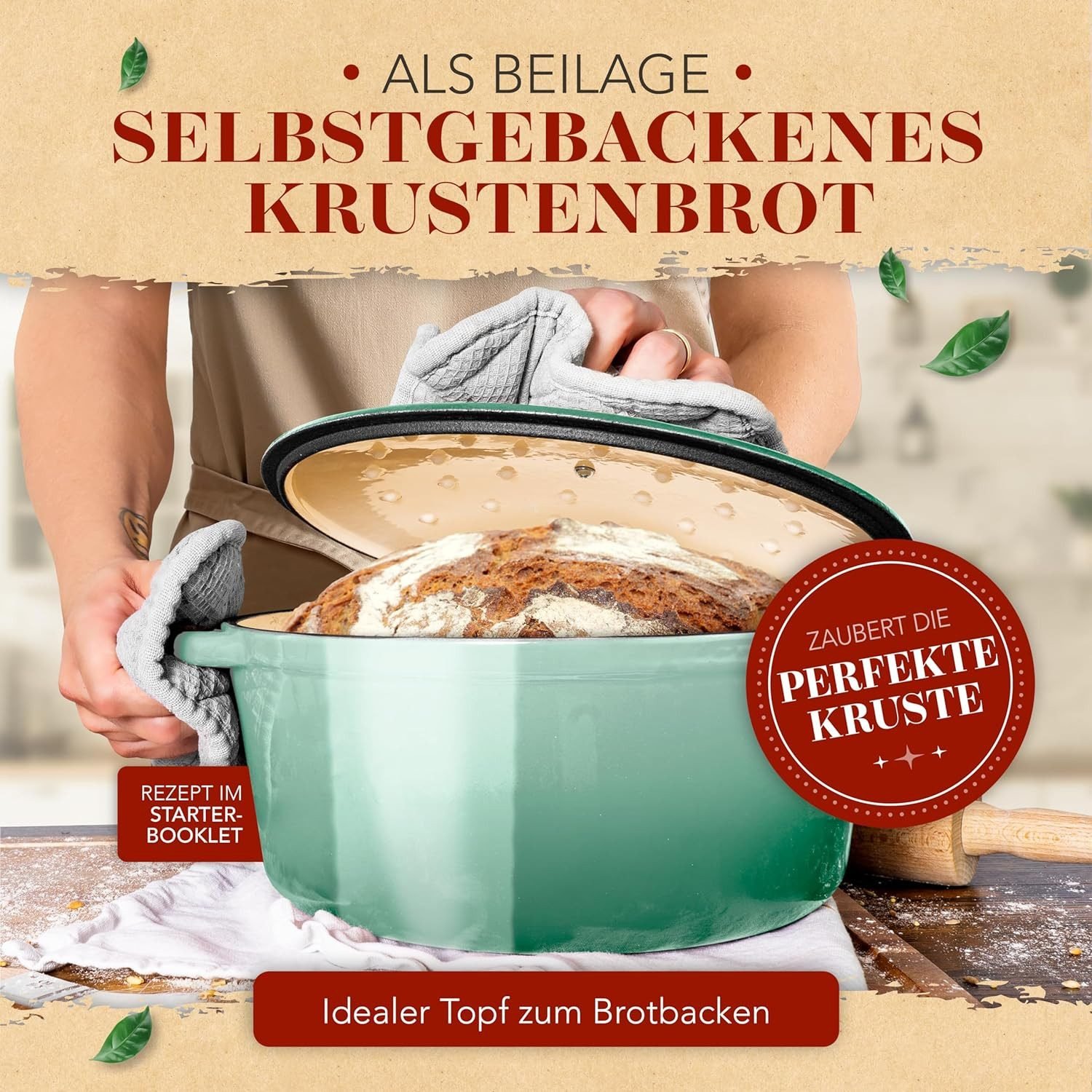 Krustenzauber Schmortöpfe Krustenzauber Schmortopf Gusseisen Topf [inkl. Fleischgabel] backofengeeignet, (Idealer Bräter mit Deckel Backofengeeignet, Kochtopf Induktion, Emaille, Bratentopf Cast Iron) Grün