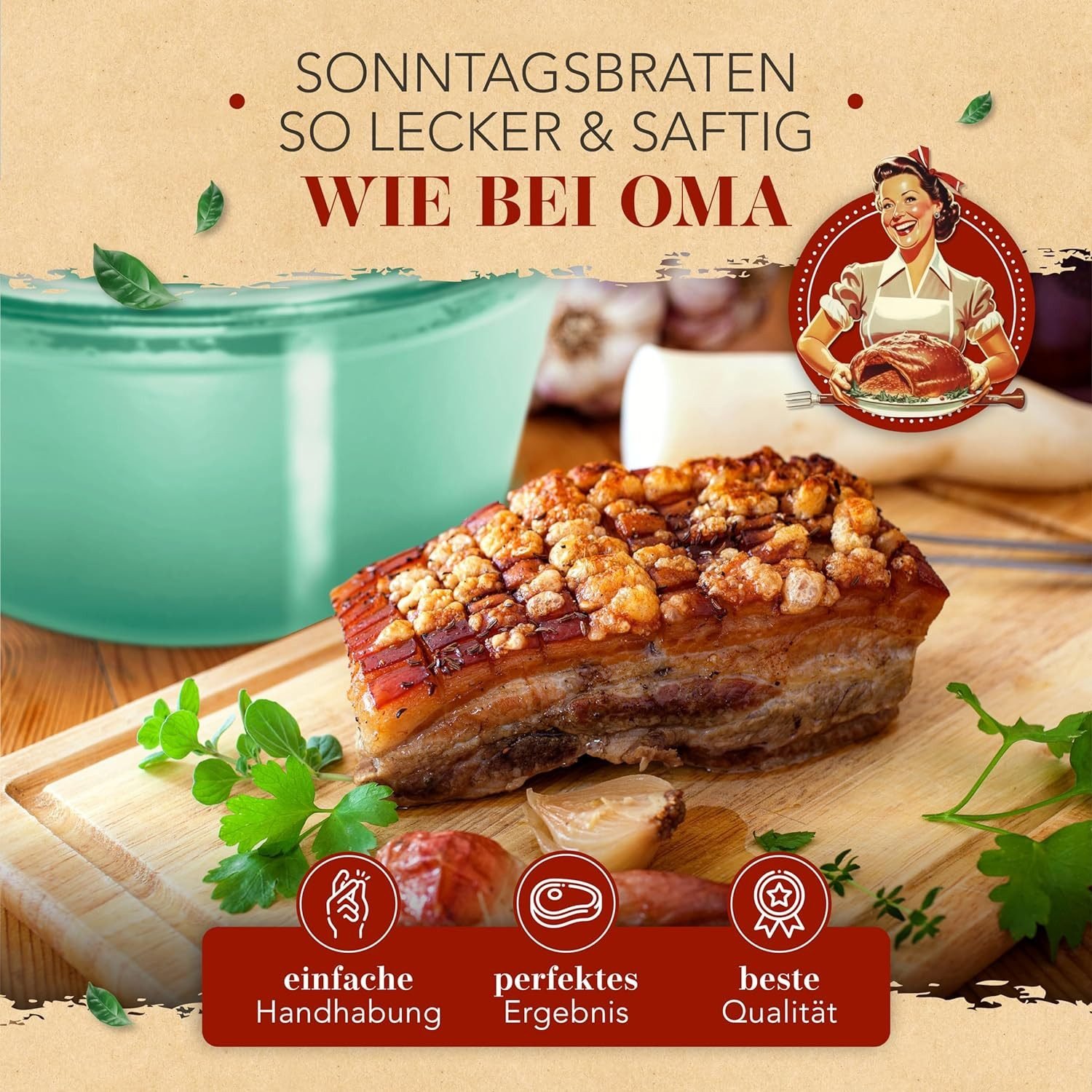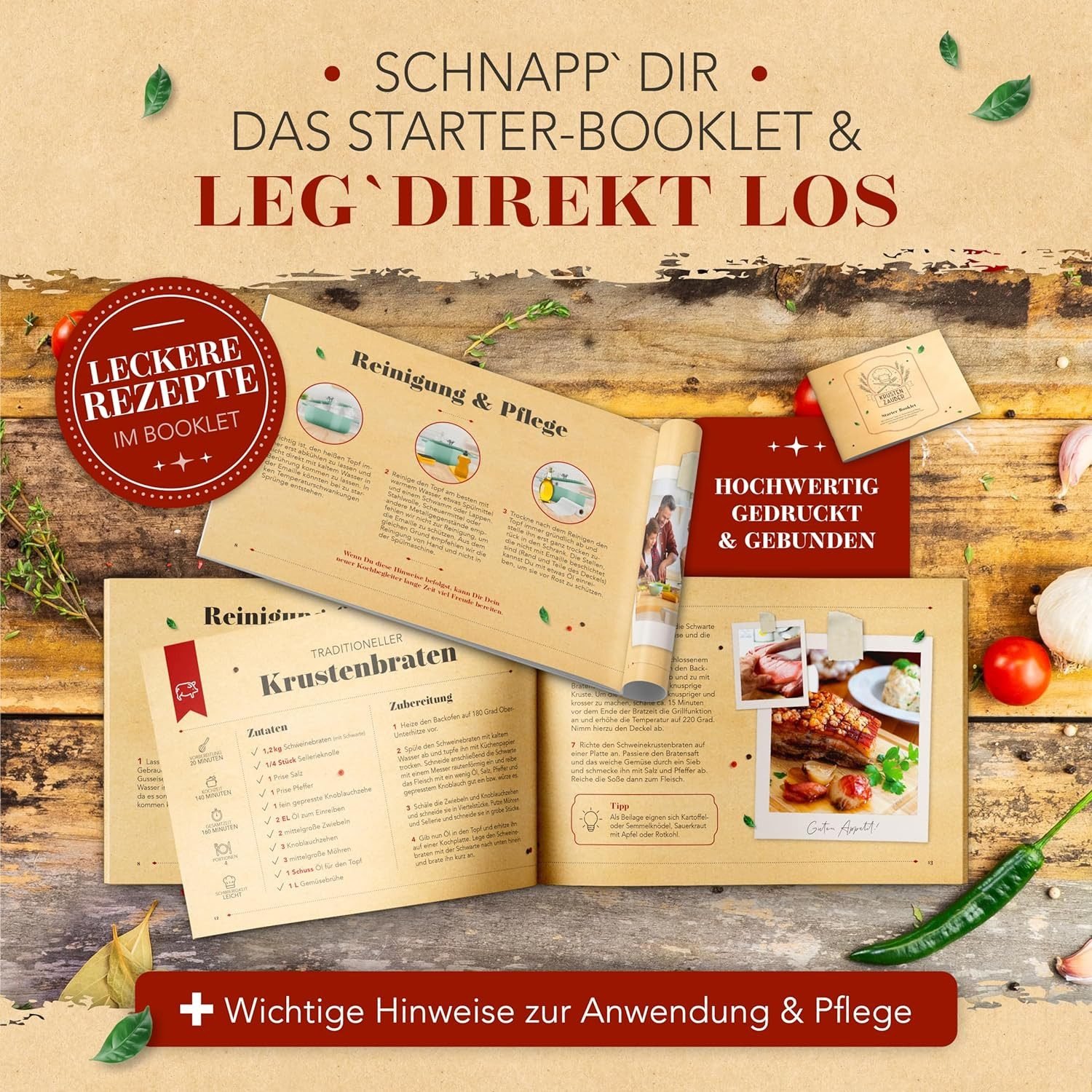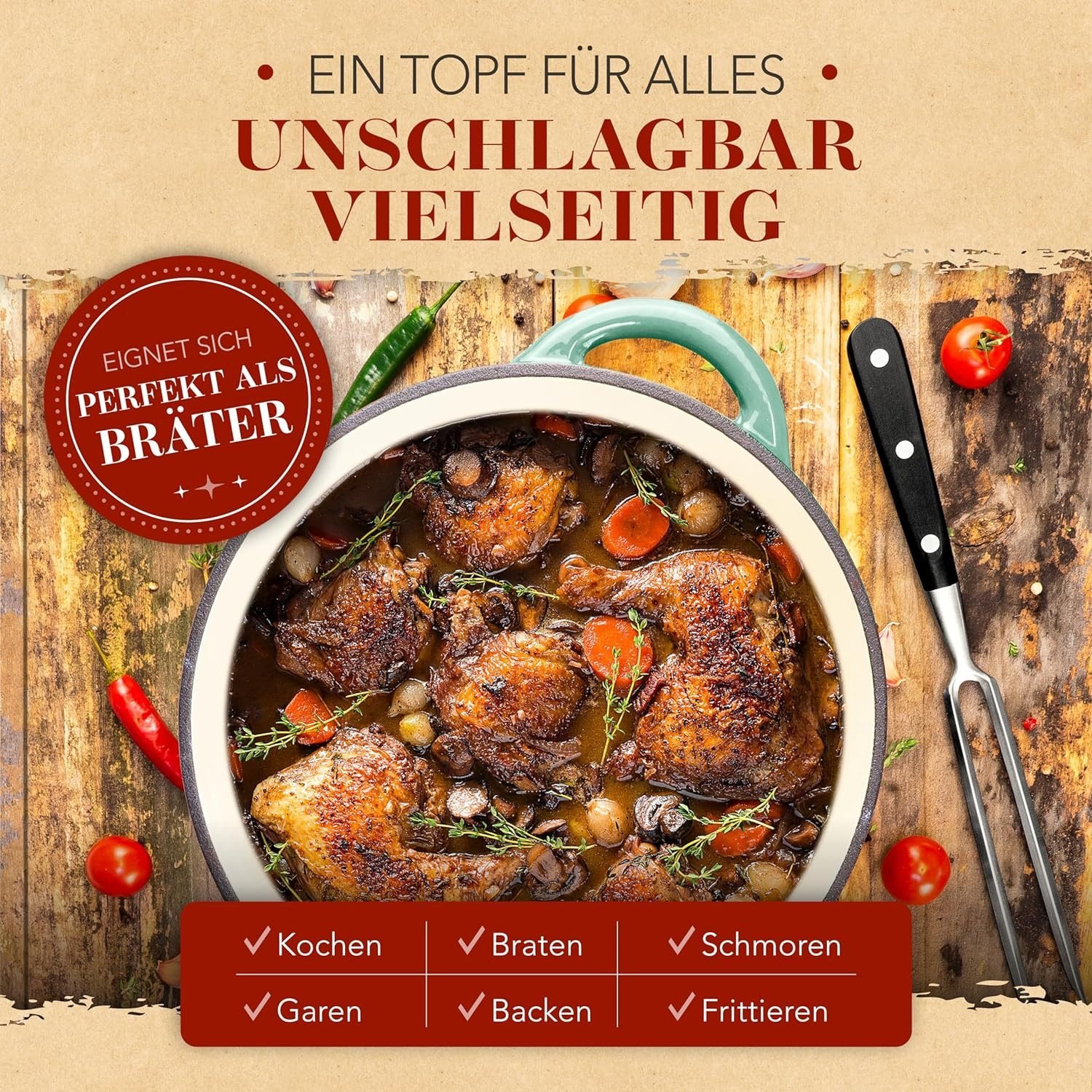 TRADITIONELLES KOCHERLEBNIS – Tauche ein in die Welt der traditionellen Küche. Mit Deinem neuen Gusseisen Topf inkl. Fleischgabel kannst Du dank beiliegender Rezeptvorschläge direkt starten HERZHAFTER KURSTENBRATEN… – zartes Gulasch oder leckere Rouladen. Der 26cm Schmortopf sorgt durch eine gleichmäßige Wärmeverteilung für perfekte Kochergebnisse und ist der ideale Gusseisen Bräter FLEXIBEL EINSETZBAR – Der Gusseiserne Topf ist backofengeeignet und perfekt für alle Herdarten, wie Gas, Elektro oder Induktion. Der Kochtopf und die Fleischgabel aus Edelstahl formen ein perfekte Set FÜR UND MIT DEINEN LIEBSTEN – Verzaubere Deine Freunde und Familie mit leckeren Gerichten aus dem Gusstopf und mache Kochen und Essen wieder zum gemeinsamen Erlebnis. Ihr werdet es lieben KRUSTENZAUBER VERSPRECHEN – Als Deutsches Unternehmen mit Liebe zum Backen stehen wir für hohe Qualität und besten Service. Sollte etwas mit Deinem Schmortopf Set nicht passen, sind wir immer für Dich da