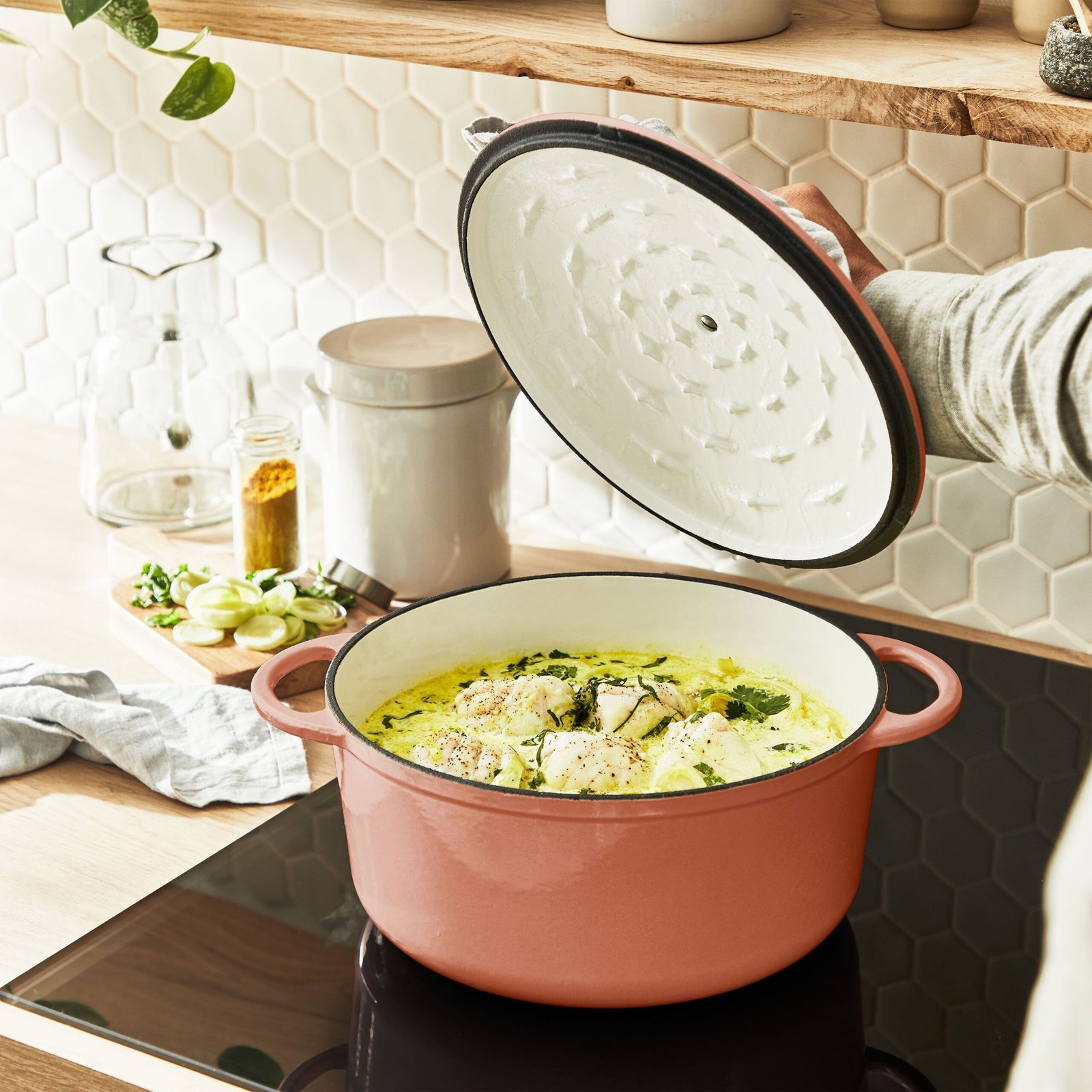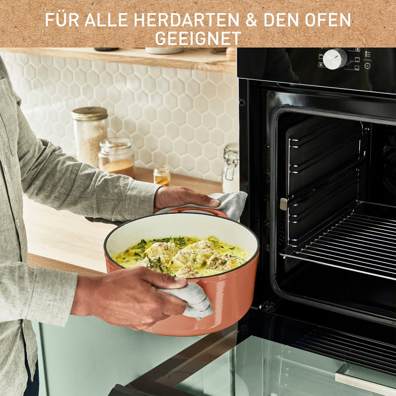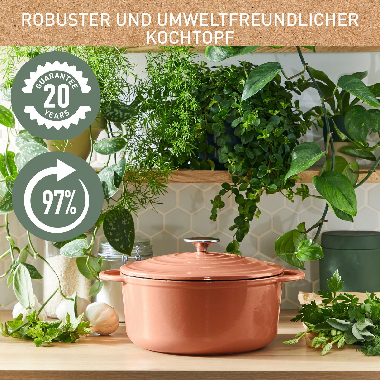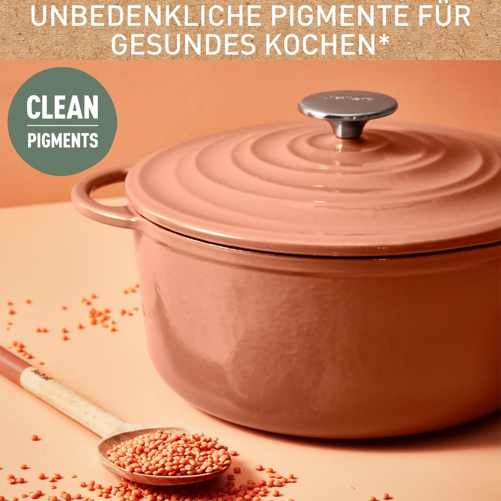 Mit LOV von Tefal, einem robusten und umweltfreundlichen Gusseisentopf aus 97% wiedergewonnenem Eisen, kochen Sie nach Ihrer wahren Natur. Dank seiner blei- und kadmiumfreien, unbedenklichen Pigmente können Sie jederzeit schmackhafte Eintöpfe kochen, die für die ganze Familie sicher sind. Dank des Kondensationsdeckels und der optimalen Wärmespeicherung sind gesunde Rezepte zum Greifen nah und das Rezept-E-Book ermöglicht das ganze Jahr über perfekte Eintöpfe. Der LOV-Kochtopf ist mit allen Herdarten – von Induktion bis Gas – und natürlich mit dem Backofen bis maximal 250°C kompatibel und ermöglicht es Ihnen, Ihr volles Potenzial auszuschöpfen. Dank der extragroßen Fläche und des starken Bodens sorgt LOV für ein schnelles Erwärmen und eine homogene Wärmeverteilung im Kochtopf. Das wunderschönen Design mit Emaille-Beschichtung überzeugt in zarten Naturtönen und eignet sich auch optimal zur Präsentation auf dem Essenstisch – für leckeres Kochen mit Stil!
