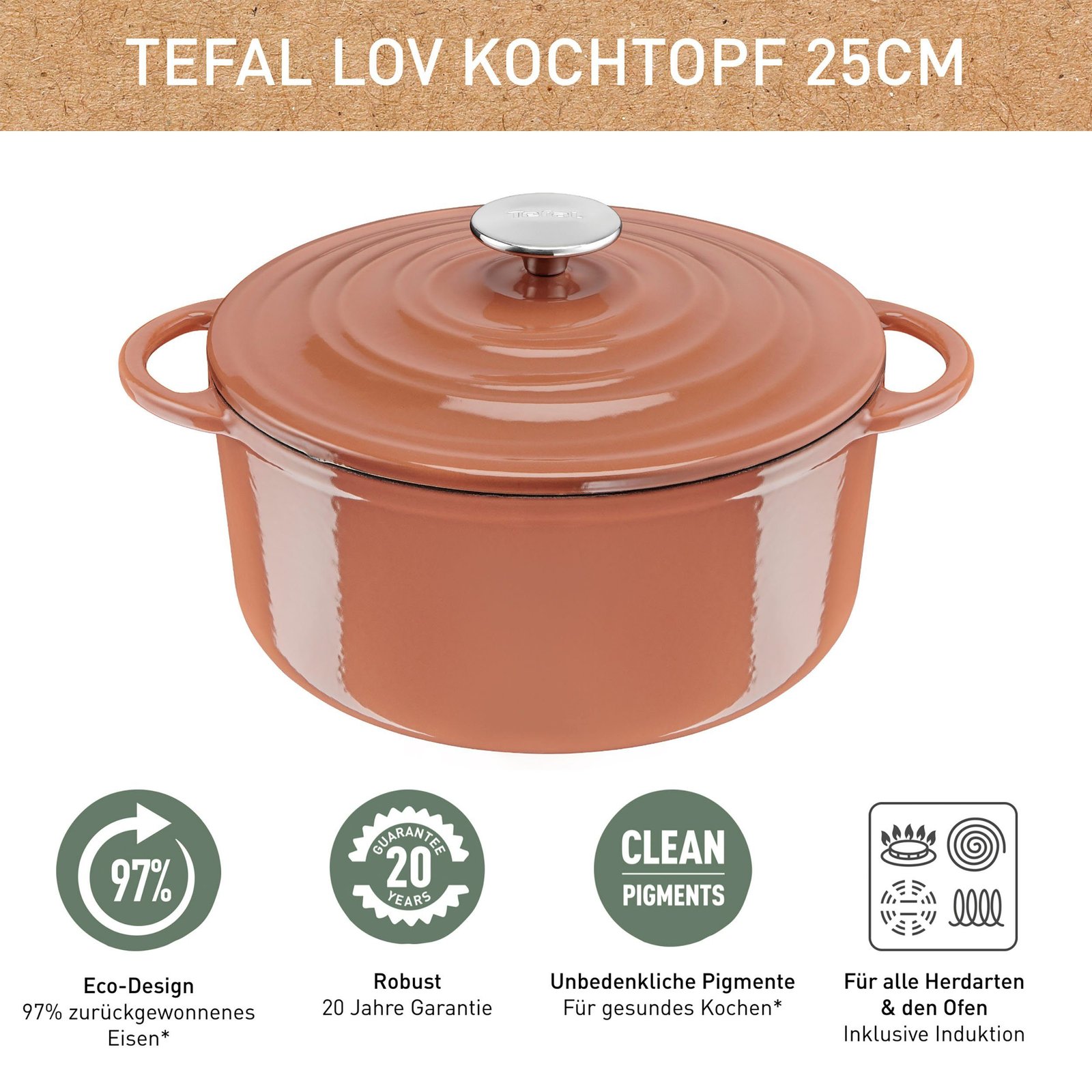 Tefal Kochtopf LOV, Gusseisen (1-tlg), umweltfreundlich, unbedenkliche Pigmente,Schongaren, Ø25 cm, Induktion terrakotta Gemüsetöpfe Tefal