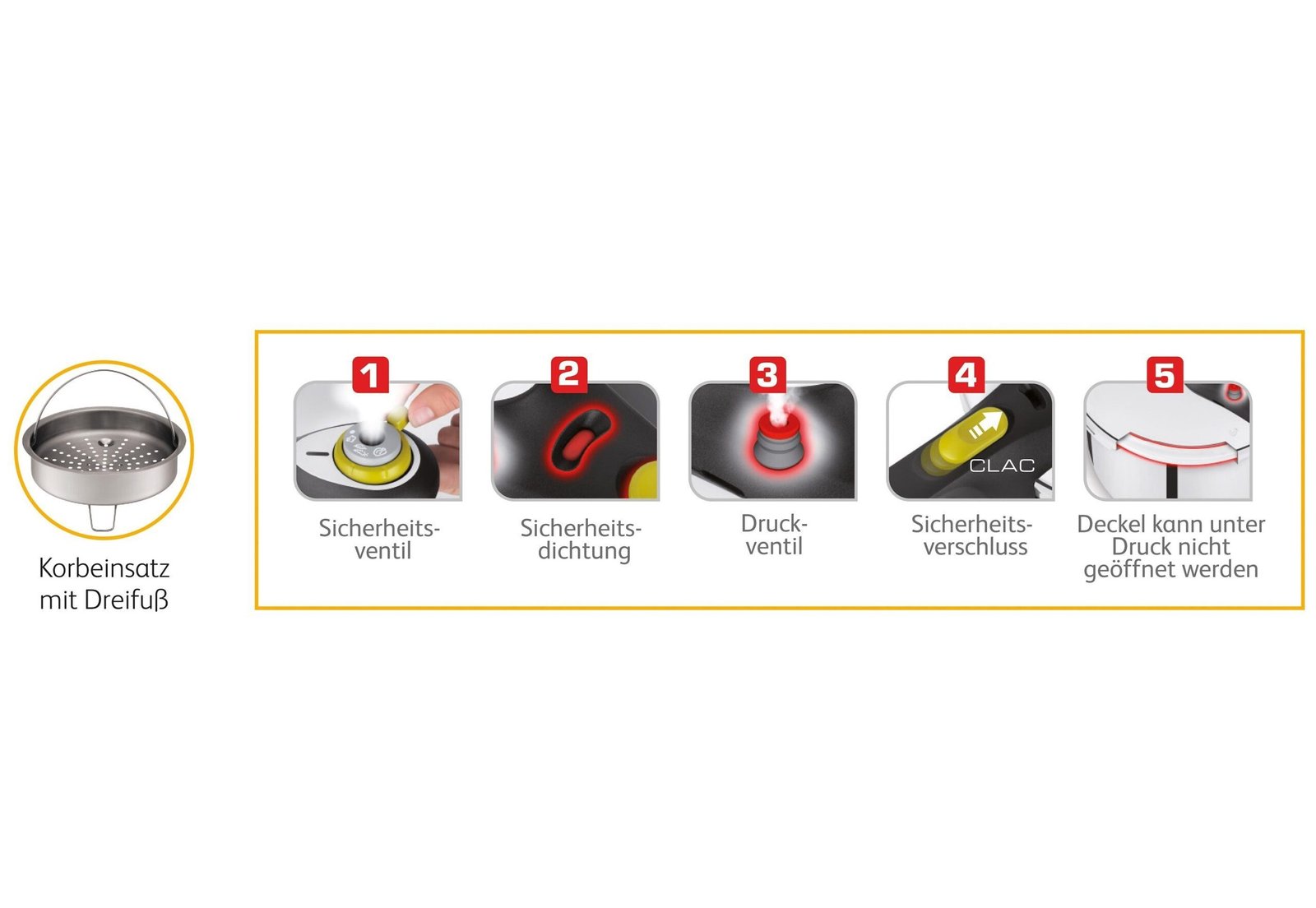 Der Secure 5 Neo Schnellkochtopf von Tefal ist aus hochwertigem Edelstahl gefertigt und macht Sicherheit und Geschmack zu seiner Priorität. Dank seines exklusiven Sicherheitssystems ermöglicht er ein rundum sicheres Kochvergnügen, während die Zutaten im Inneren schonend gegart werden. Zusätzliche Sicherheit sorgt das druckgesteuerte Ventil, das Sicherheitsventil sowie die Dichtung, welche übermäßigen Dampfdruck dank kontrollierter Dampfabgabe regulieren. Der Schnellkochtopf bietet zwei verschiedene Kochprogramme, womit sowohl Gemüse als auch Fleisch und Fisch schonend zubereitet werden können. Dank des Dampfkorbs bleiben auch die Vitamine und der Geschmack aller Zutaten vollständig erhalten. Der langlebige Schnellkochtopf eignet sich für alle Herdarten, einschließlich Induktion und ist zudem bis auf sein Zubehör spülmaschinenfest. Für eine noch längere Haltbarkeit des Secure 5 Neo Schnellkochtopfs empfehlen wir jedoch, diesen mit der Hand zu reinigen.