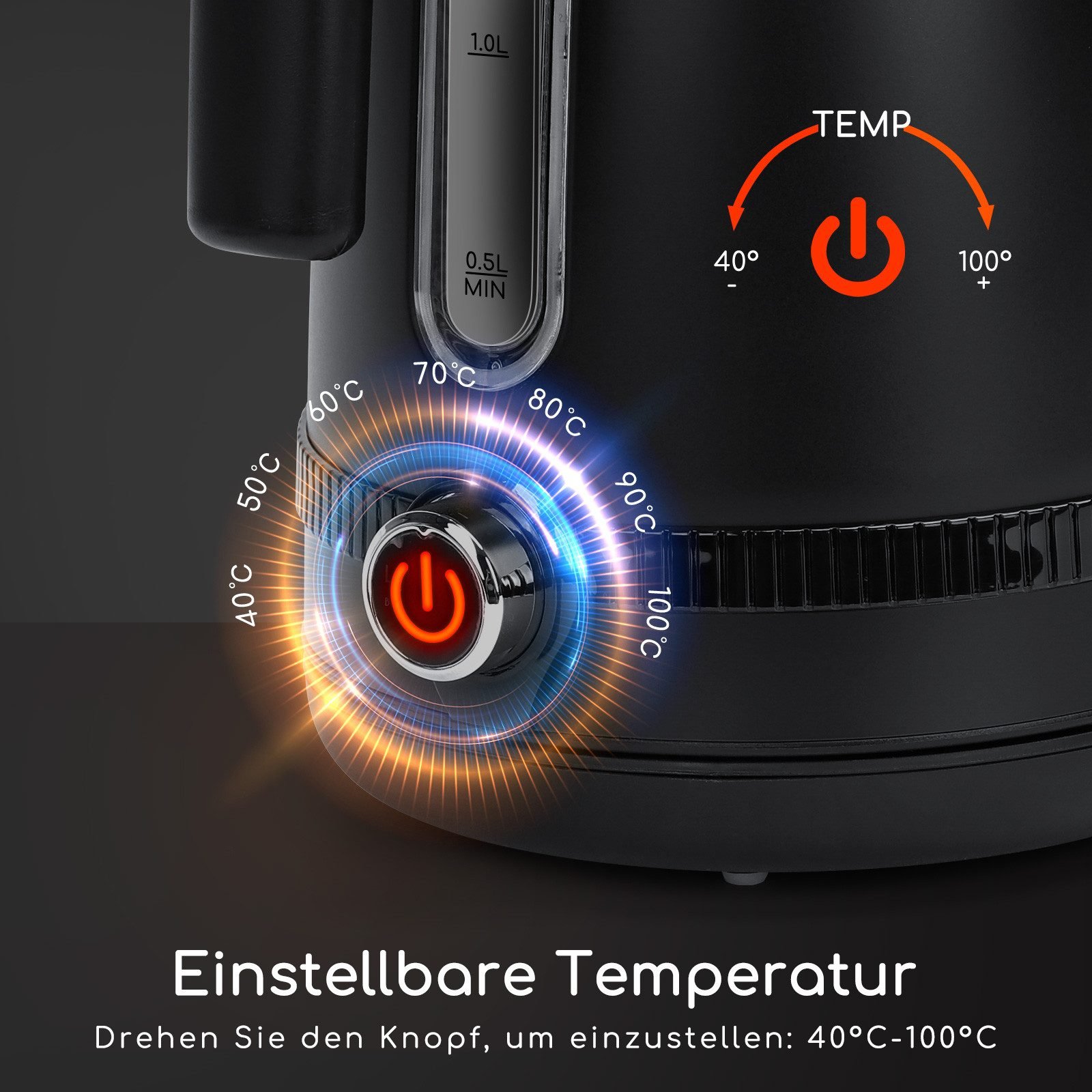 Wasserkocher mit Temperatureinstellung Individuelle Temperaturwahl für optimale Brühtemperatur 7-stufige Temperaturvorauswahl & holographischer Echtzeit-Indikatorbildschirm, Temperatur 40°C – 100°C wählbar Schnelles Kochen und 2 Stunden Warmhalten Digitale Temperaturanzeige Herausnehmbarer, abwaschbarer Kalk-Wasserfilter Abnehmbarer Deckel für eine einfache Reinigung Automatische Abschaltung, Überhitzungsschutz und Trockenkochschutz