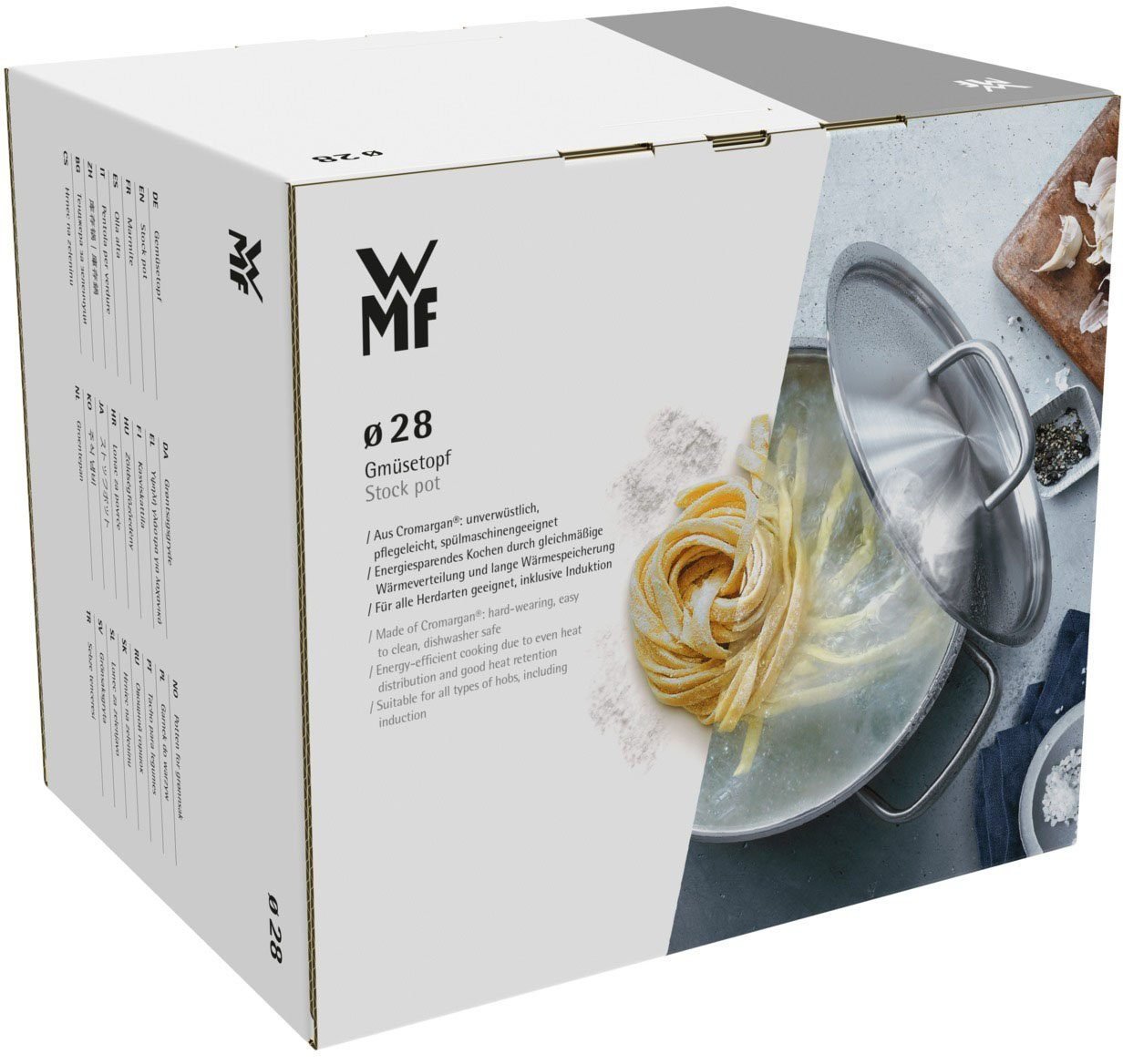 Der WMF Gemüse- und Suppentopf eignet sich hervorragend zum kochen von großen Mengen. Auch Eintöpfe, Knödel, Spagetti und andere Pasta Sorten gelingen in dem Topf sehr gut. Durch den hohen Rand wird die aufsteigende Wärme besonders gut genutzt: Großblättriger Spinat lässt sich bequem blanchieren, Gemüse schonend dünsten oder garen. Geben Sie einfach ein wenig Wasser hinein und garen Sie die Zutaten im Wasserdampf. Der Dampf kondensiert am Deckel und fließt wieder ins Kochgut zurück und bleibt somit im Topf. Ebenso können Sie diesen Topf aber auch zum Braten/Schmoren verwenden. Er heißt zwar Gemüsetopf, aber es wird schnell klar: Mit ihm kann man fast alles zubereiten um hungrigen Gästen oder der Familie eine leckere Mahlzeit zu zaubern. Der Topf ist mit einem breiten Schüttrand versehen, durch den das Abgiesen von Flüssigkeiten wie z.B. Nudelwasser erleichtert wird. Er ist aus rostfreiem Cromargan Edelstahl und besitzt einen TransTherm Allherdboden. Daher ist er für alle gängigen Herdarten, wie Induktionsherde, Gasherde, Elektroherde, und Glaskeramik-herde geeignet. Dank der optimalen Wärmeverteilung brennt nichts an.