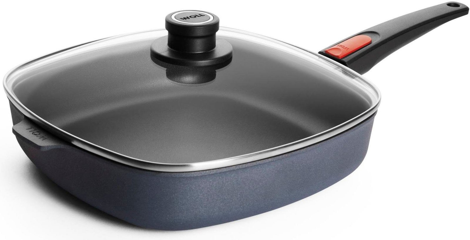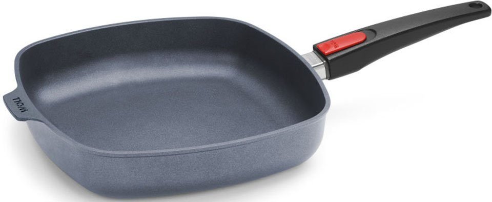 Woll Viereckpfanne »Diamond Lite« aus Aluminium-Schmiedeguss und einer Ultrahartbeschichtung mit echten eingelagerten Diamantkristallen. Außergewöhnliche Antihafteigenschaften und sehr hohe Wärmeleitfähigkeit zeichnen diese Serie aus. Die Griffe der Pfanne sind zudem abnehmbar. Für alle Herdarten, auch für Induktion.