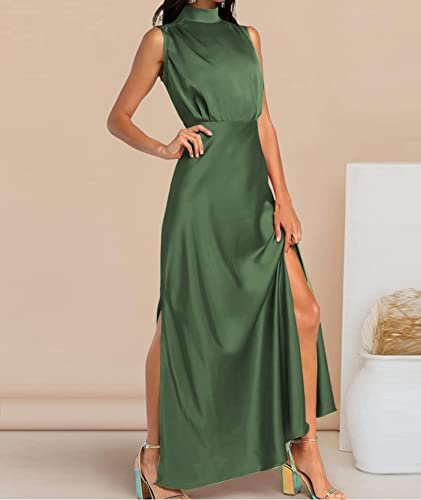 xxxiticat Women’s Satin Tank Dress Elegant Sleeveless Mock Neck Split Hem Slip Wedding Party Formal Maxi Dress Army Green AG ‎womens Dresses