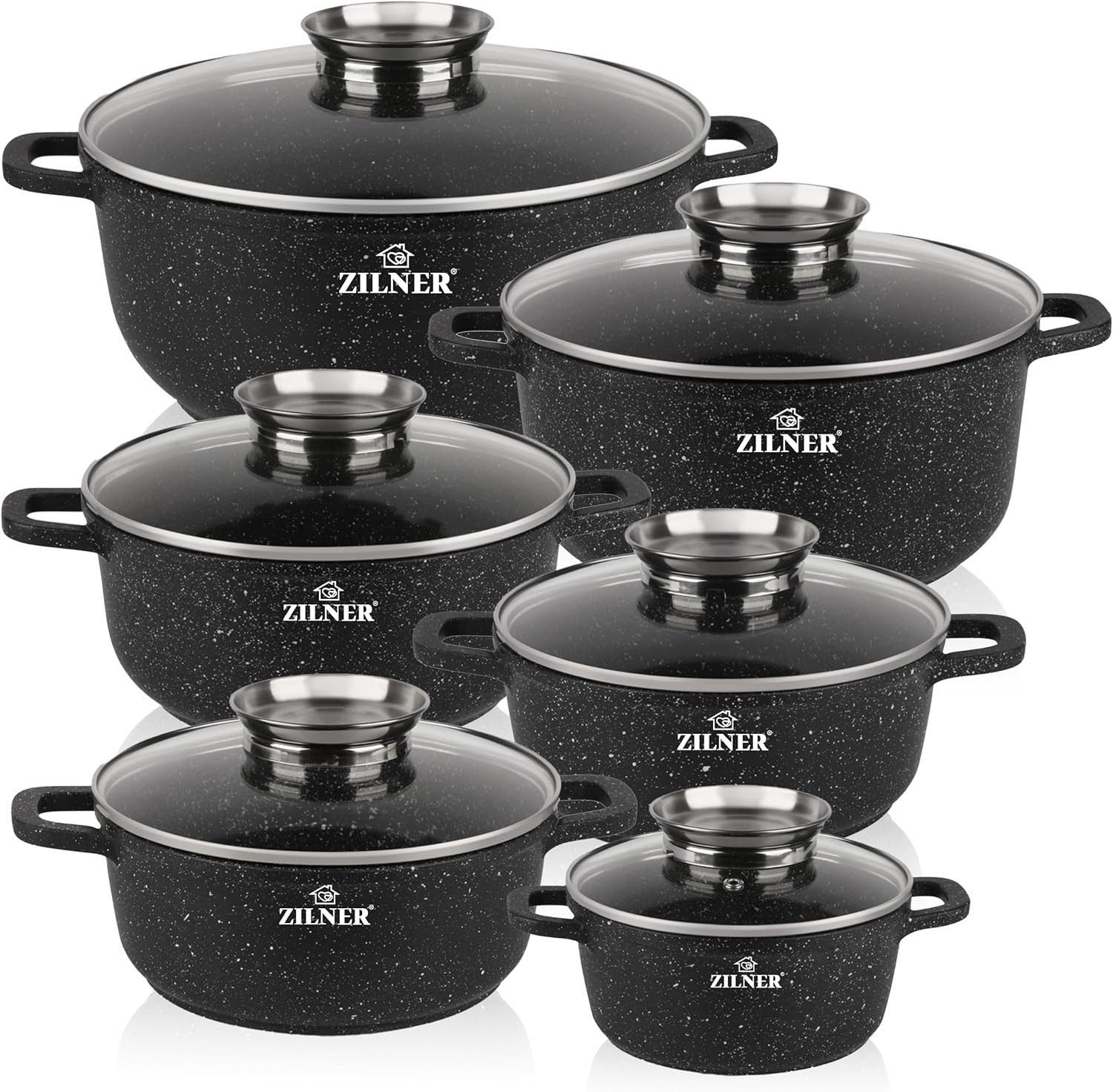 Zilner Zilner Topf-Set Schwarze Töpfe in 6 verschiedenen Größen, Steinbeschichtung, Aluminiumguss, Keramik, Edelstahl (1.3L / 2.3L / 3.2L / 4.5L / 6.8L, 12-tlg., Zeitloses Design des Topfsets. Eine ideale Geschenkidee! Hochwertig) Topfsets